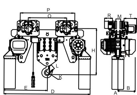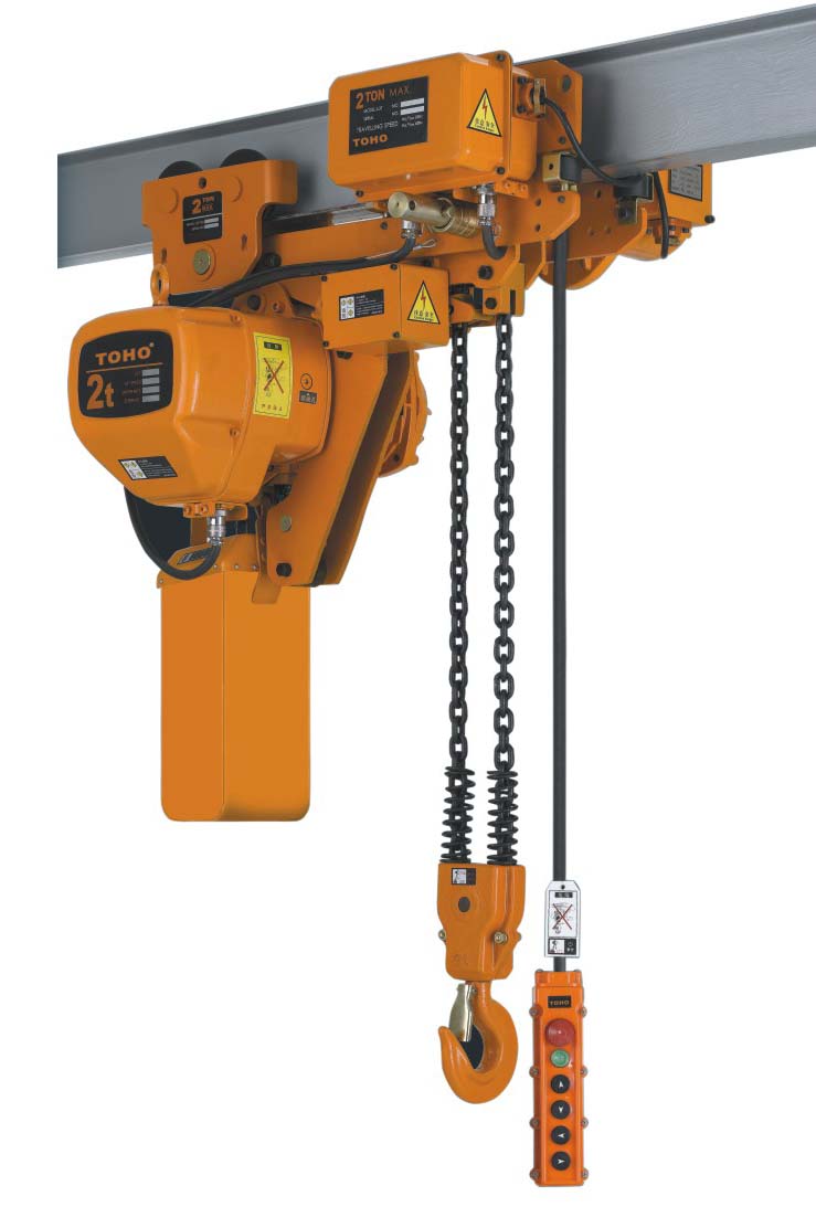 低净空环链电动葫芦由2个跑车以及一个电动主机组合而成。